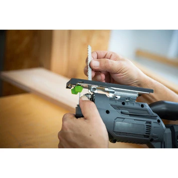 De LUX accu decoupeerzaag is geschikt voor het zagen in hout, aluminium en staal. De maximale zaagdikte in hout is 80 mm, in aluminium is dit 12 mm en in staal is deze 5 mm. Je kan de zaaghoek instellen tussen de 0° en 45°. De decoupeerzaag heeft ook een aansluiting voor stofafzuiging en vier pendulum standen.