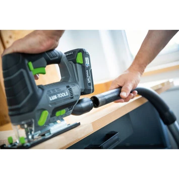 De LUX accu decoupeerzaag maakt gebruik van de uitwisselbare accu’s van het LUX 20V accuplatform. Gebruik dezelfde accu voor alle LUX 20V (tuin)machines. De zaag wordt geleverd exclusief accu, deze zijn apart verkrijgbaar in de bouwmarkt.
